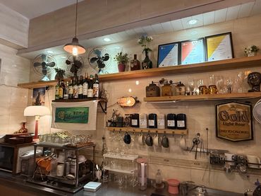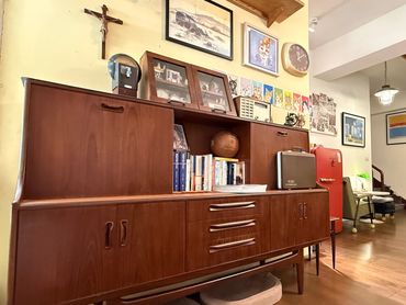 不是設計的出來,是慢慢長的出來的。每帶回一件新的收藏,就重新想一次把它放在哪裡、和誰關心。北歐書櫃旁邊有一台德國檯燈,旁邊有一盞老燈,燈光打下來,整個場景就像某個1960年代的歐洲黃昏。